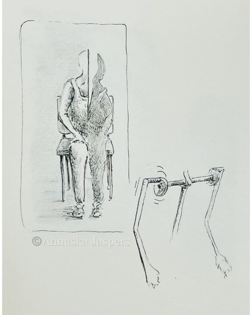 De linkerhelft van de persoon, getekend in schaduw en stilte, verbeeldt de kant die ik lange tijd na mijn ongeluk niet meer vanzelf voelde. Ernaast de mechanische armen, symbool voor het deel van mijn bewegingsapparaat dat ook niet goed meer werkte door bijkomend trauma.